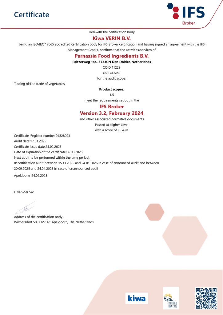 Parnassia Food Ingredients is IFS Broker 3.1 certified at Higher level.